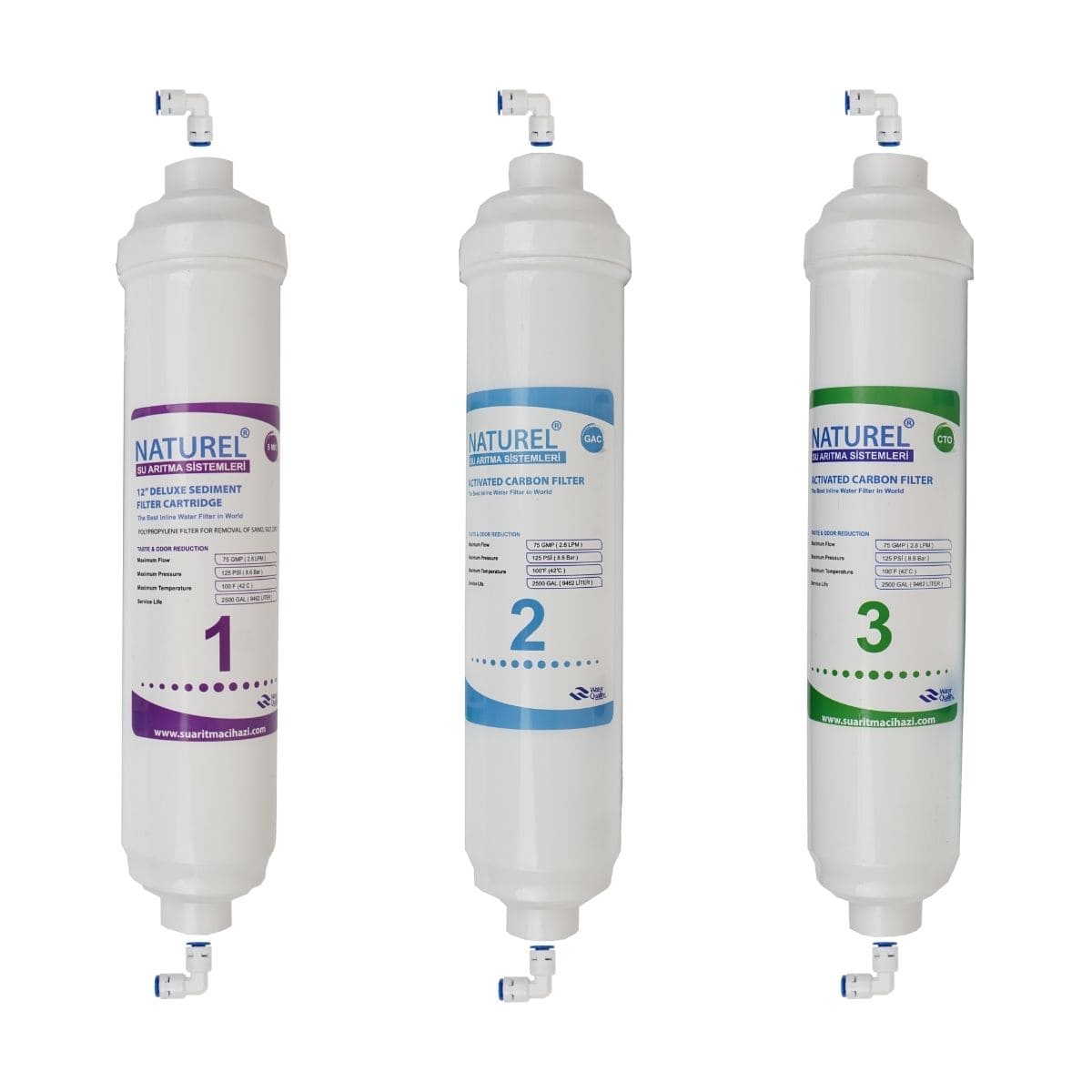 Inline Premium 3lü Filtre Seti’nde Sediment Filtre, Granül Aktif Karbon Filtre, Blok Karbon Filtre bulunmaktadır.